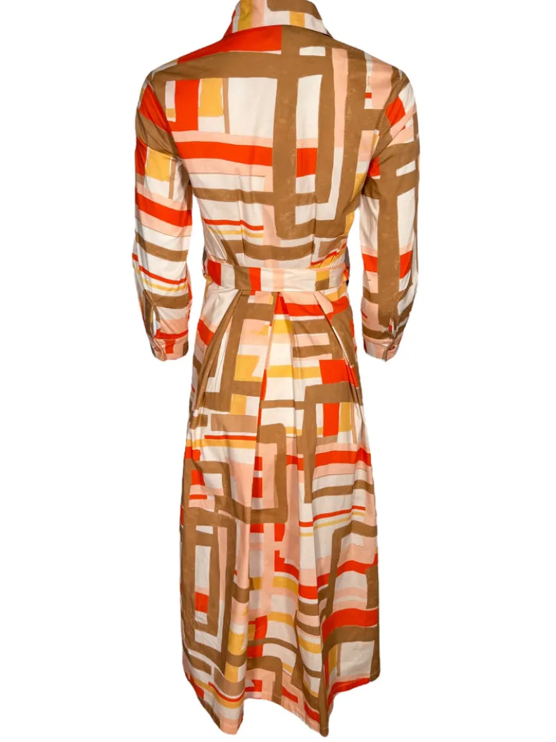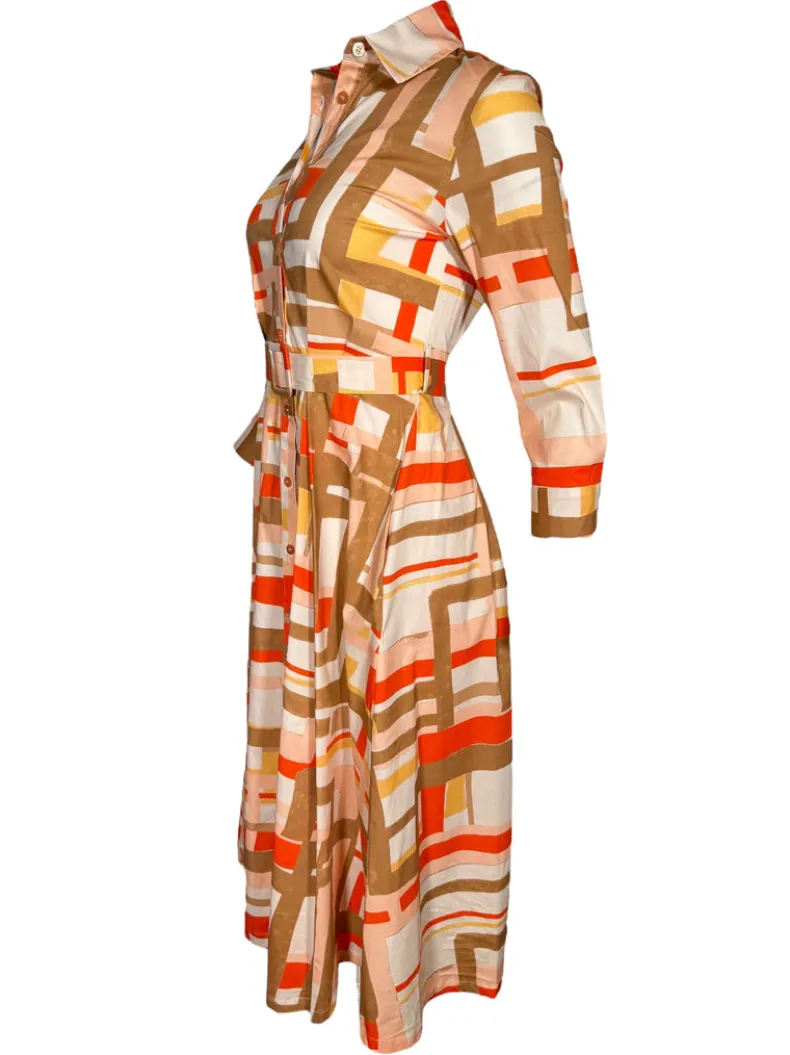 A stretch cotton shirt dress with removable buckled belt. Pleated waist gives a full skirt with 3/4 length sleeves.