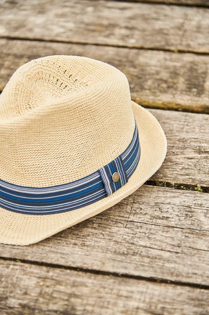 Trilby hat woven in paper and trimmed externally with a striped band and finished with an internal tartan headband.