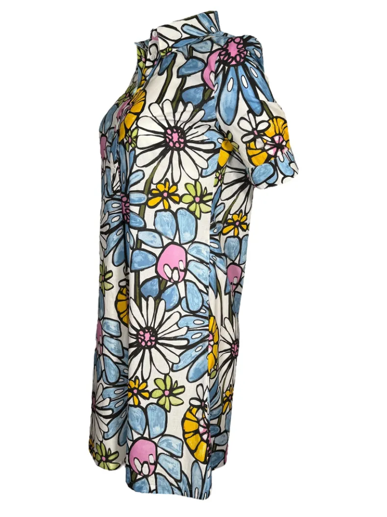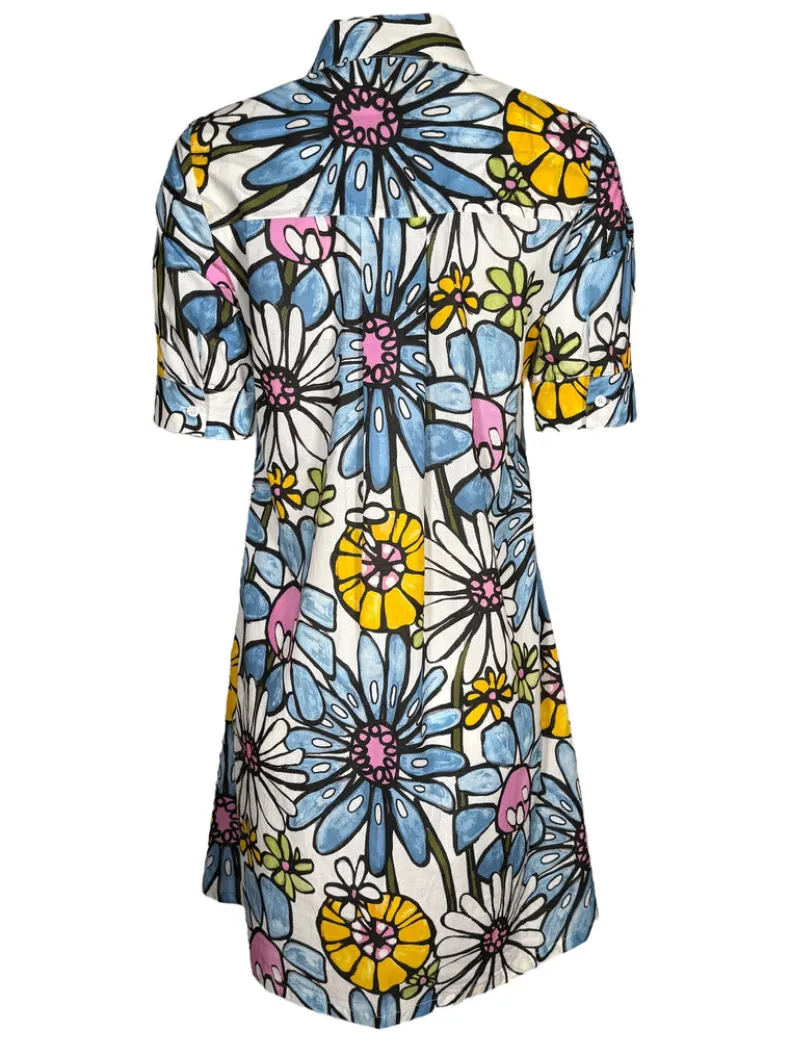 This is a short sleeved shirt dress with a slight flare in the skirt in a stretch cotton.