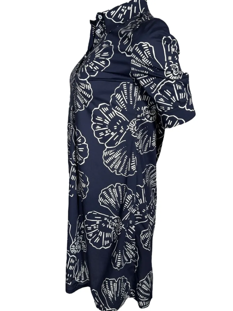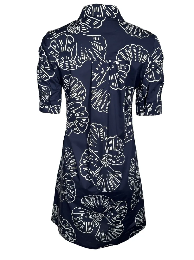 This is a short sleeved shirt dress with a slight flare in the skirt in a stretch cotton.
