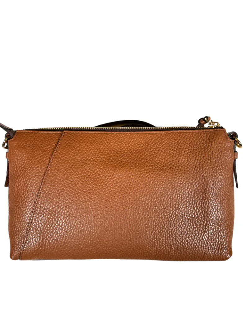 Clutch bag with chain handle, adjustable leather shoulder strap, and zippered exterior pocket.