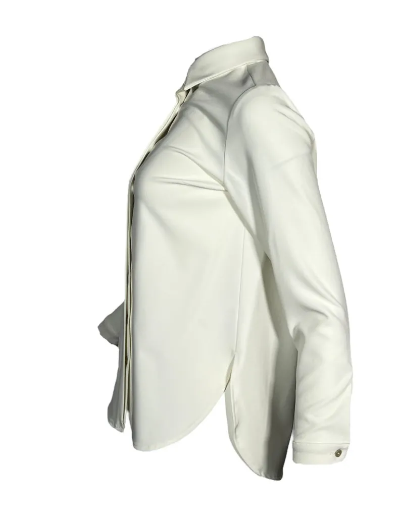 A full button front shirt with scooped hemline and single reverse pleat on back.