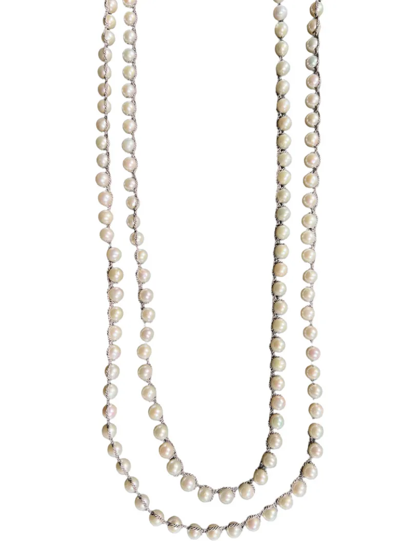 6mmwhitefreshwater pearls woven on greysilk. Can also be used as a wrapped bracelet.