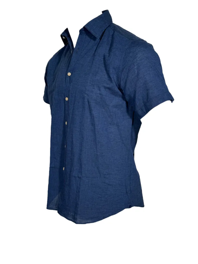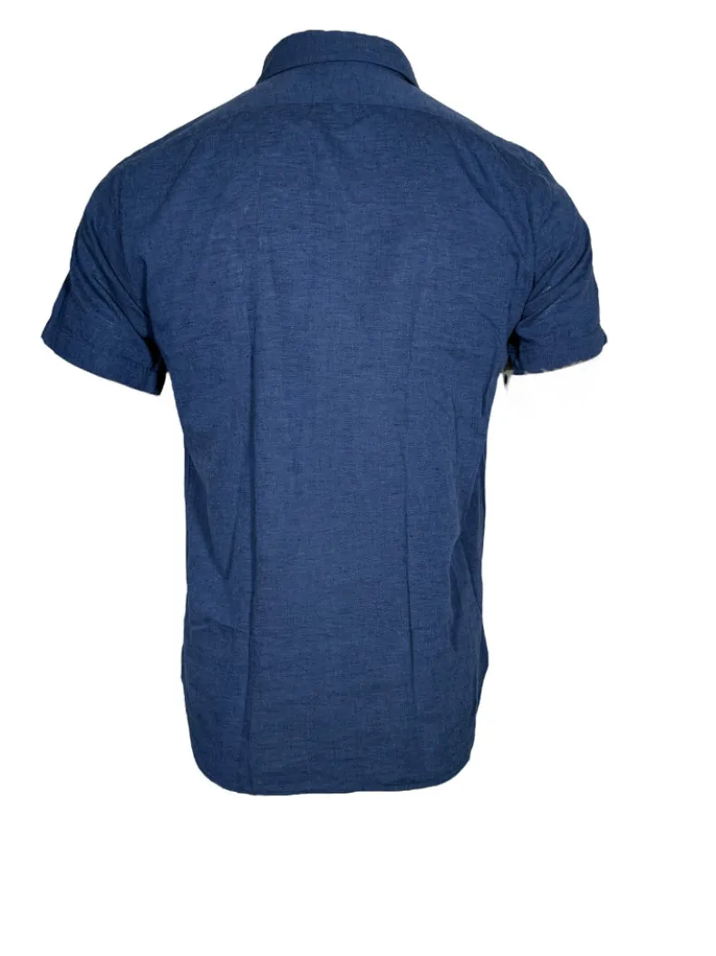 Short-sleeved sport shirt with contrast trim inside placket and a tailored fit.