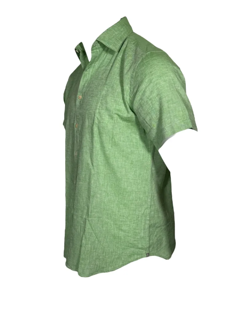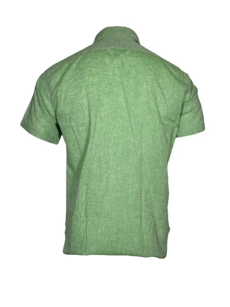 Short-sleeved sport shirt with contrast trim inside placket and a tailored fit.