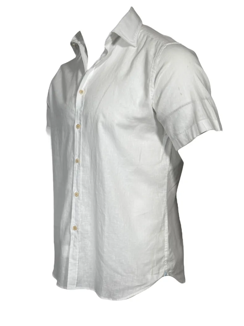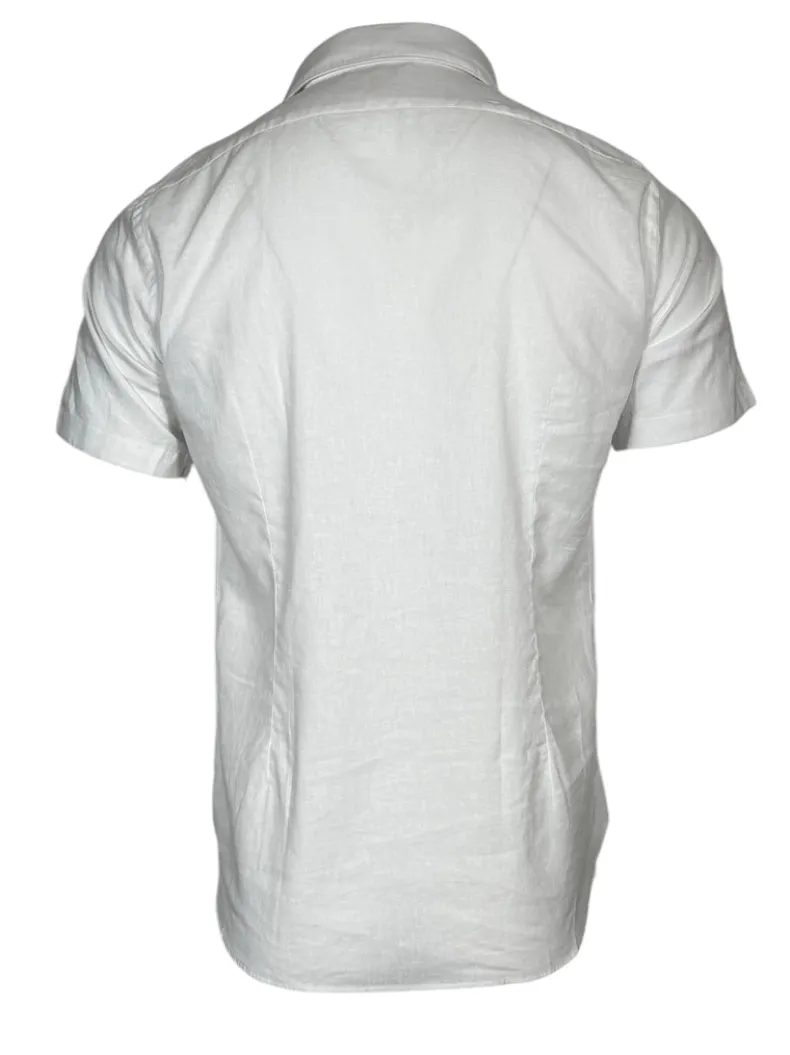 Short-sleeved sport shirt with contrast trim inside placket and a tailored fit.