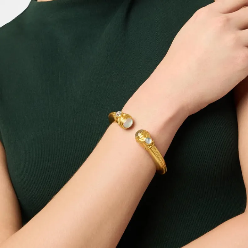 A delicately beaded golden cuff featuring polished gemstone endcaps and a geometric piercework interior.