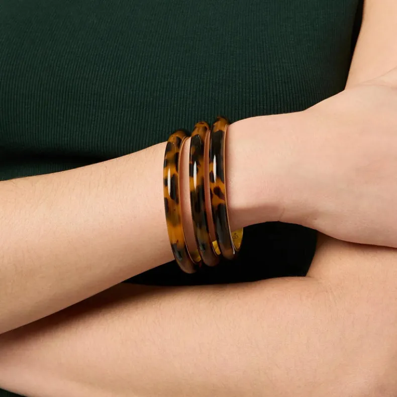 An elegantly rounded bangle of polished translucent tortoiseshell lined with smooth gold.