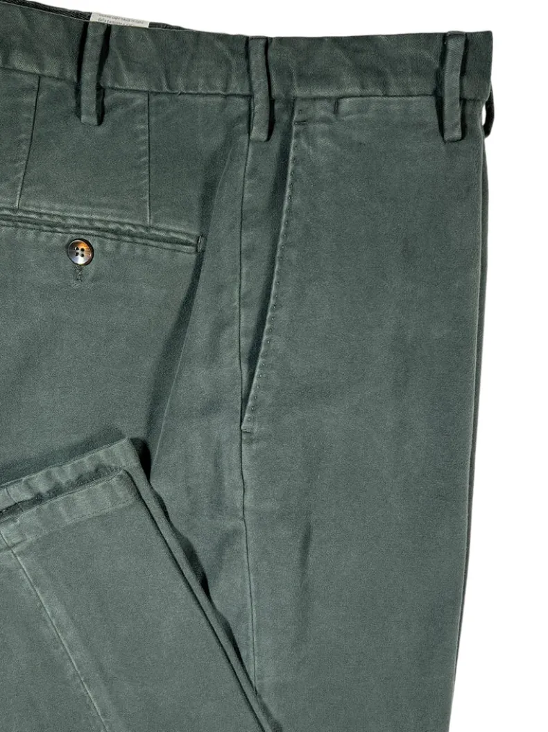 Flat front trouser in a garment dyed soft cotton stretch fabric for comfort.