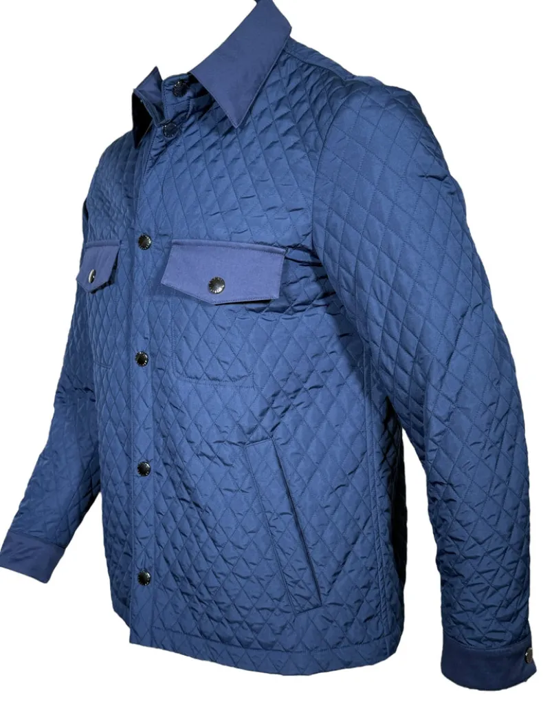 A quilted nylon jacket perfect for spring weather. Chest flap pockets and side slip pockets with a snap closure.