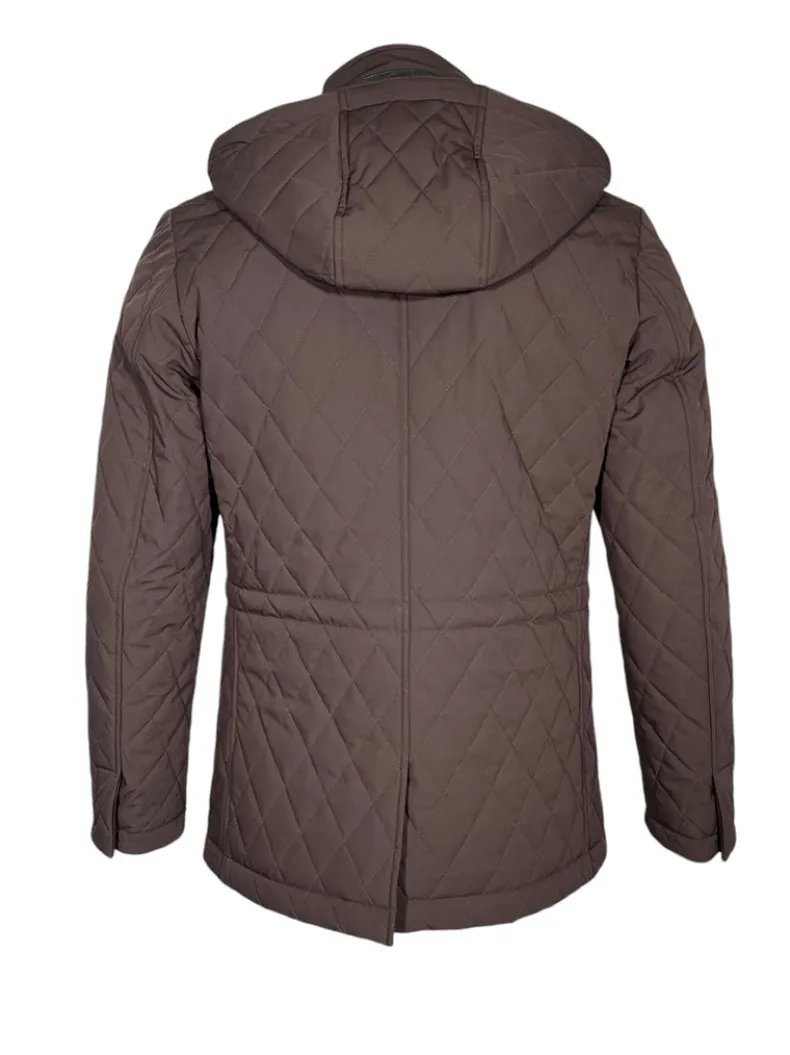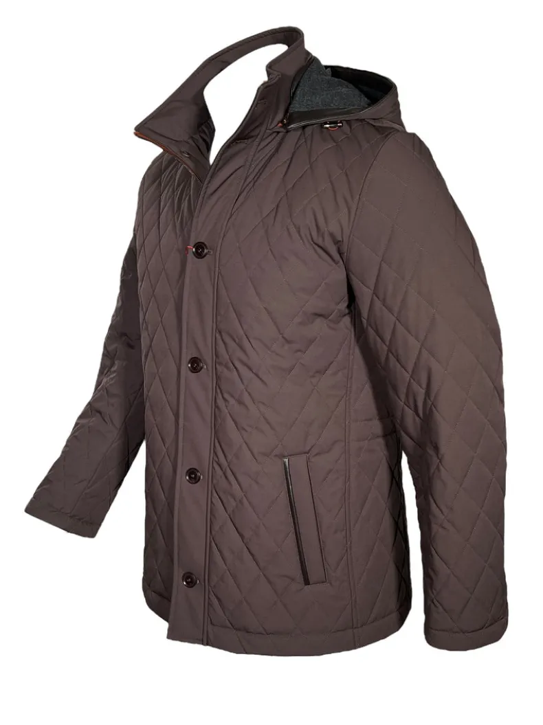 Quilted jacket with leather trim detail and double zipper/button closure. Removable hood.