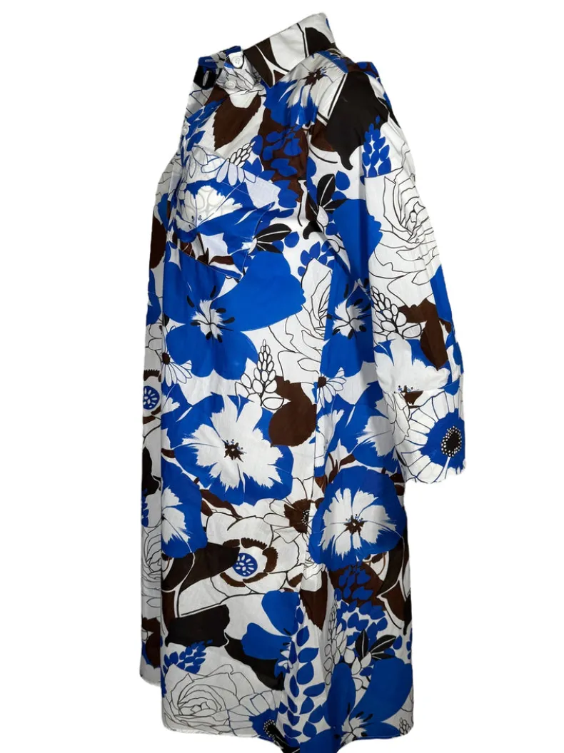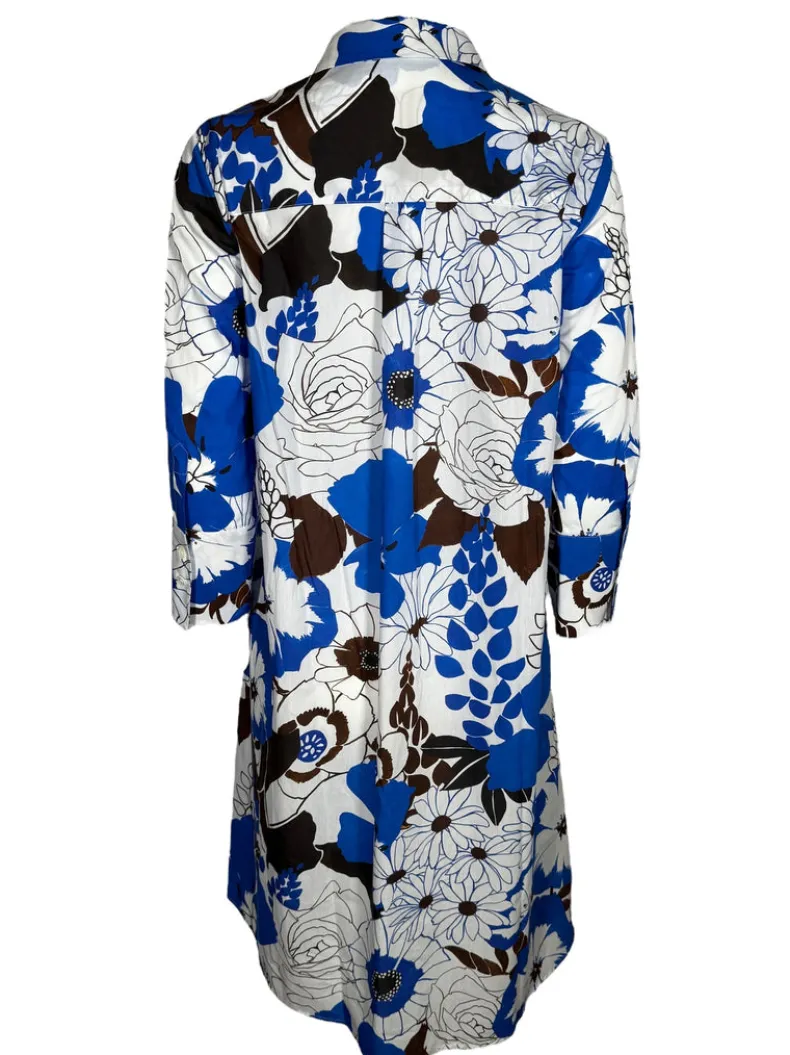 A playful, knee length summer dress with 3/4 sleeves, full button placket and side pockets on seam.