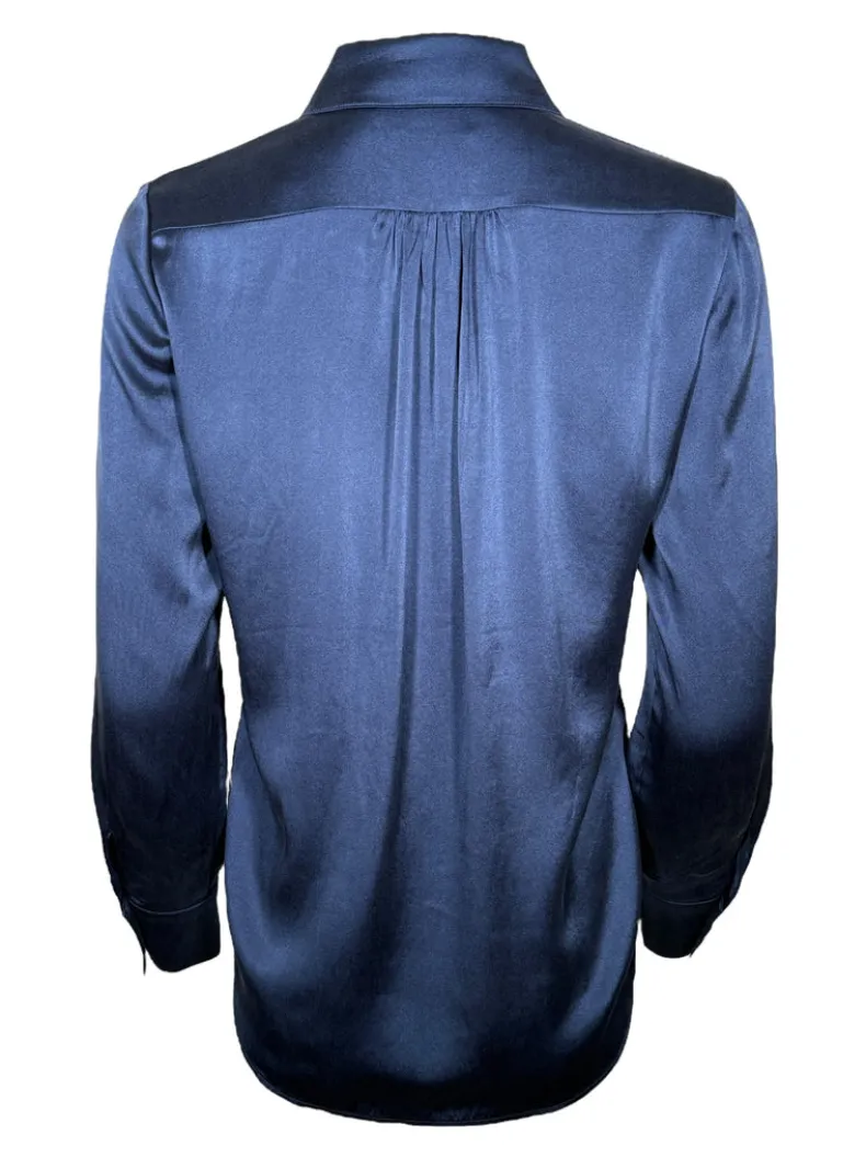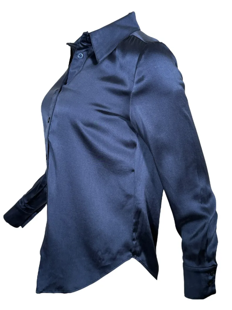 A fantastic fit in a washable, stretch silk blend. This fabric has a sand wash which creates a matte finish. The blouse gives a sophisticated look with little maintenance.