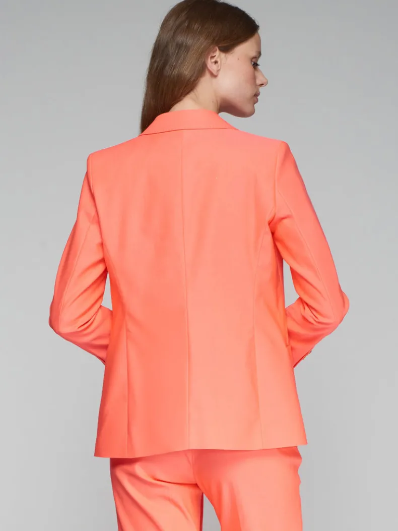 Fluor orange blazer. Front fastening with gold star button. Patch pockets. Stretch fabric and lining. Exclusive Vilagallo printed lining.