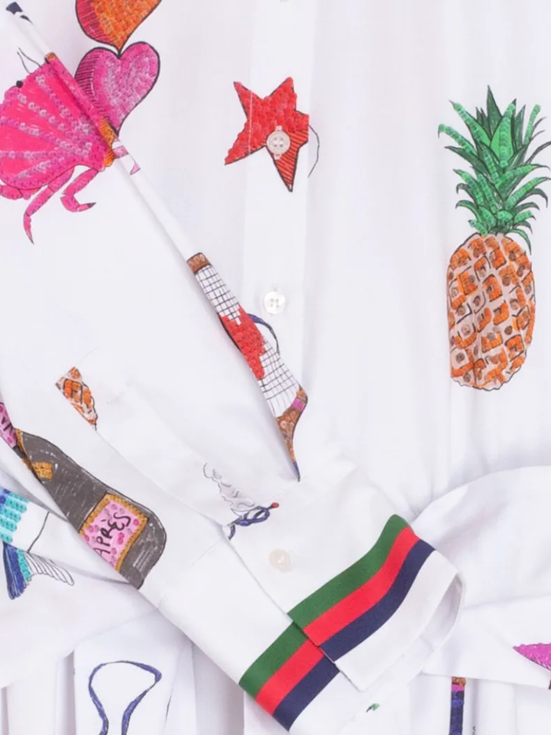 White midi dress with drawings designed by the Vilagallo team. Closure with shirt buttons up to the waist. Shirt collar. Tie to adjust to the waist.