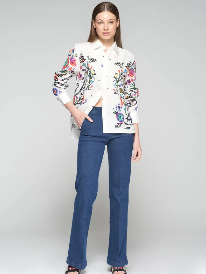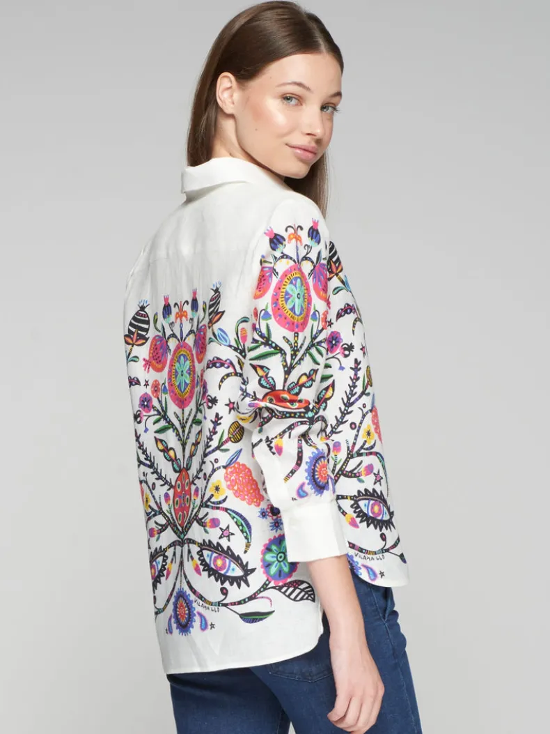 White linen shirt printed with Vilagallo’s exclusive tree of life. Front fastening with shirt buttons. Long sleeves with cuffs.