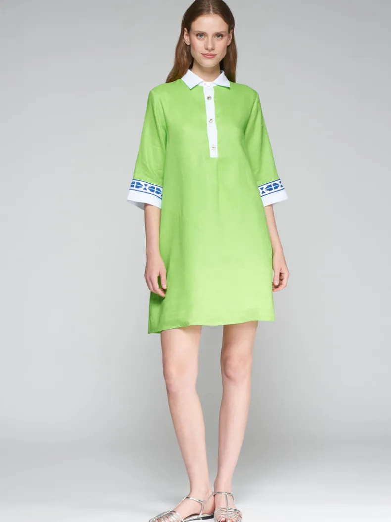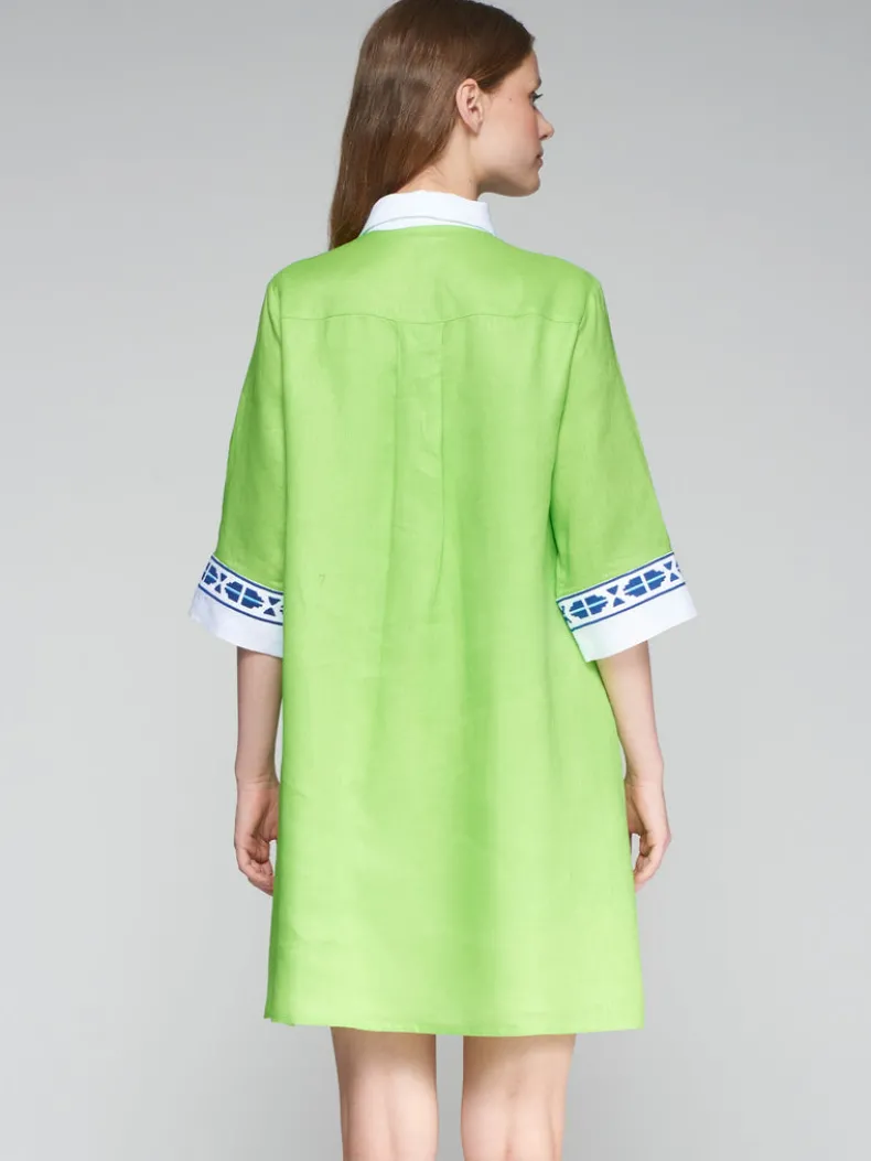 Short green linen dress with blue embroidery on the sleeves. White shirt collar with decorative palm tree buttons.