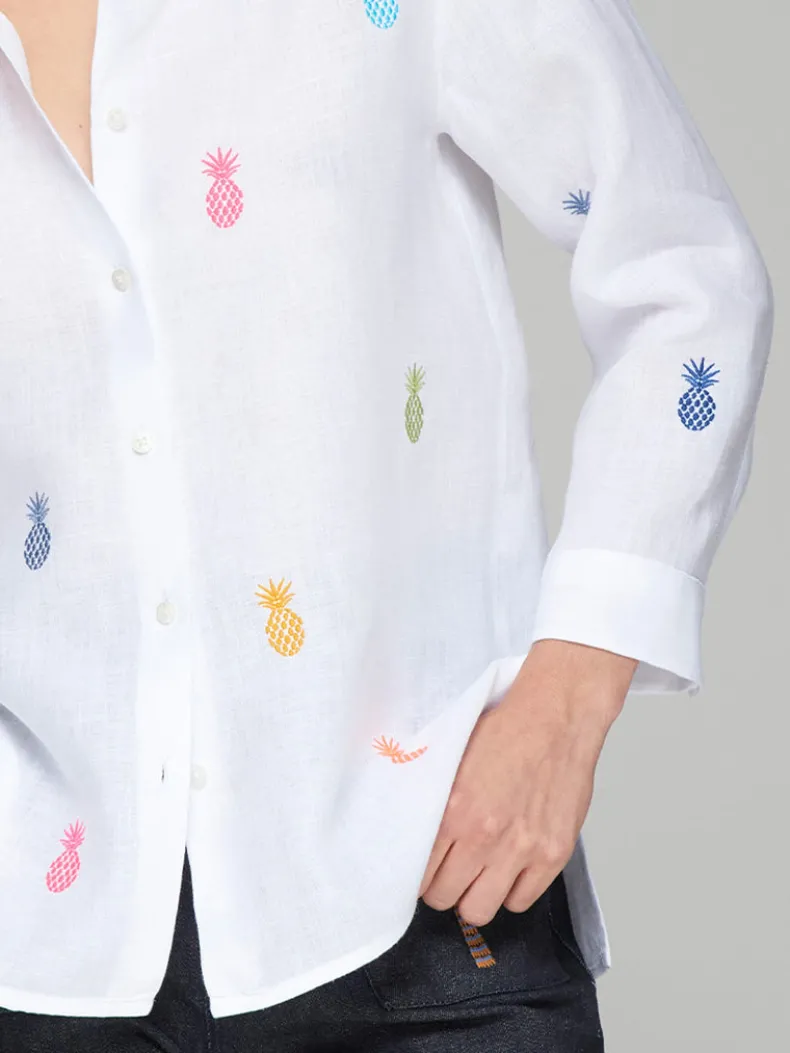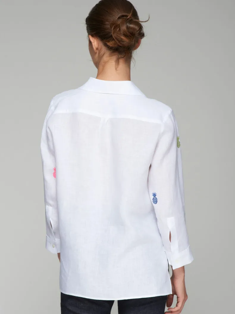 White linen shirt with embroidered coloured pineapples. Front fastening with shirt buttons. Three-quarter sleeves with cuffs.