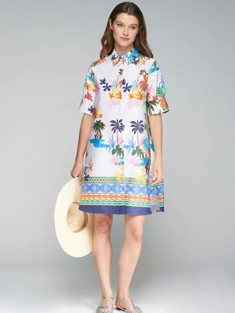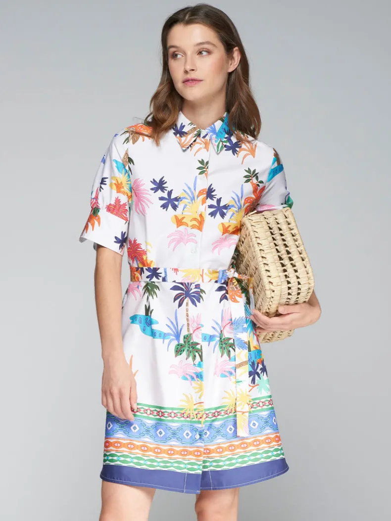 Short shirt dress with colorful palm tree print. Front closure with shirt buttons. Shirt collar. Short sleeve. Removable belt.