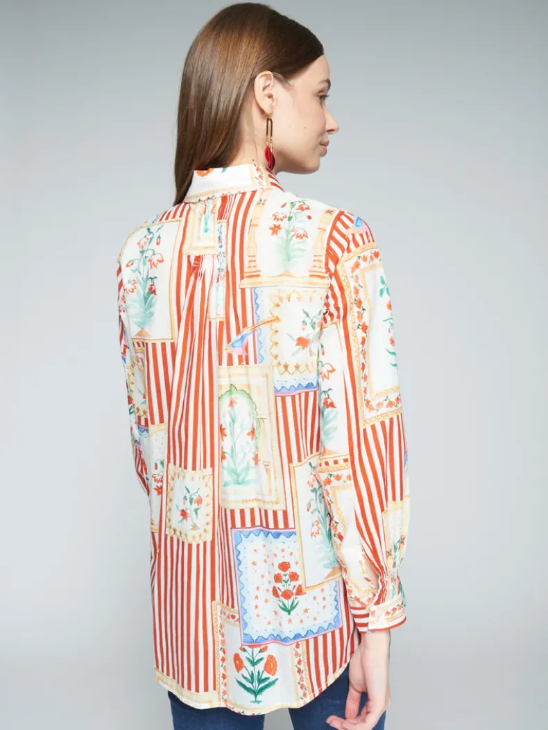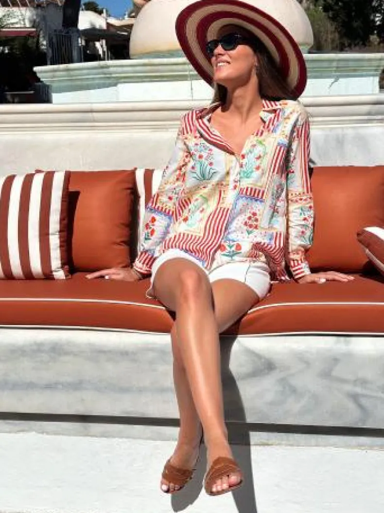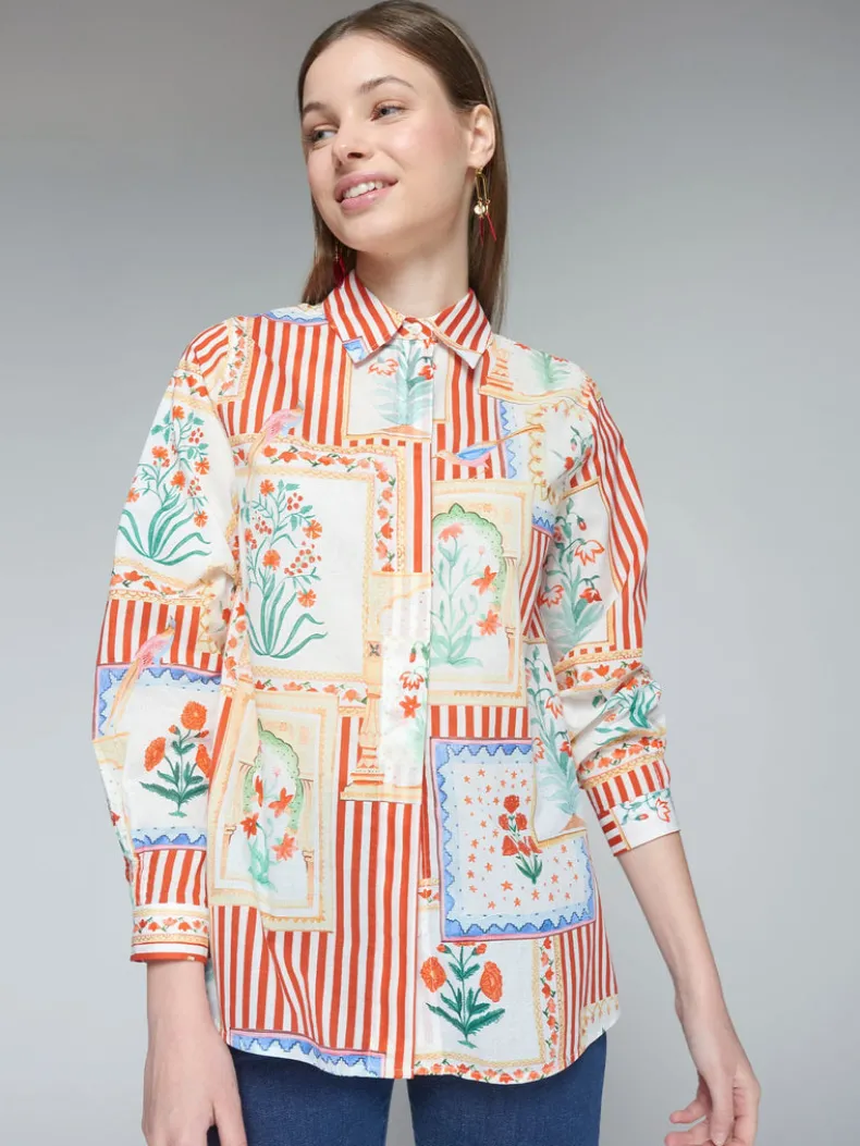 Red and white striped shirt with flower patch effect checks. Front fastening with shirt buttons. Long sleeves with cuffs.