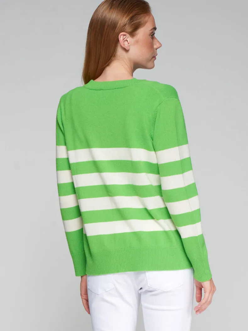 Green cardigan with four white horizontal stripes. Front fastening with green buttons and V-neck.