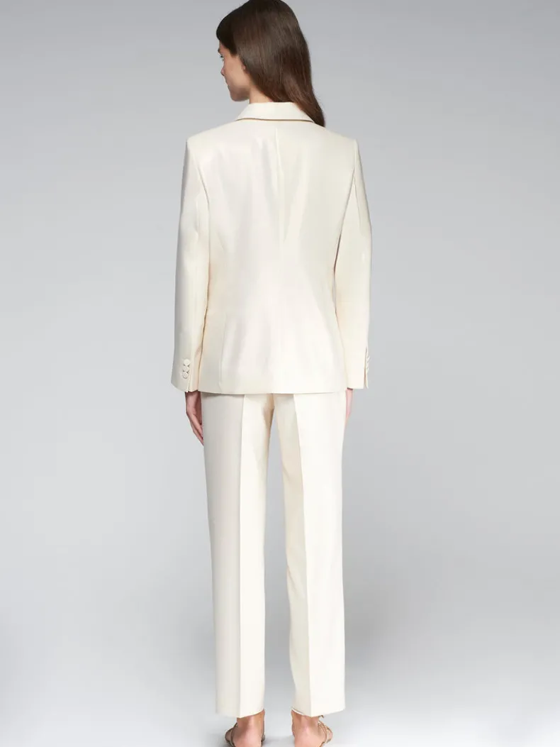 White trousers with metallic gold. Elastic waistband and front cirre with metal button. Side pockets.