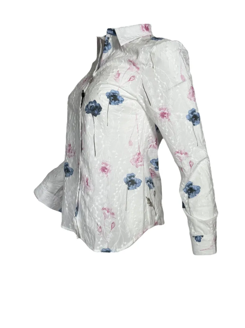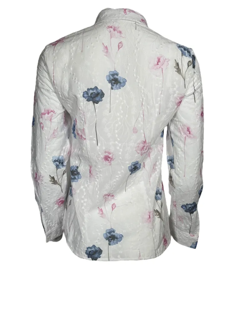 A more fitted style blouse in a lovely embroidered floral pattern.